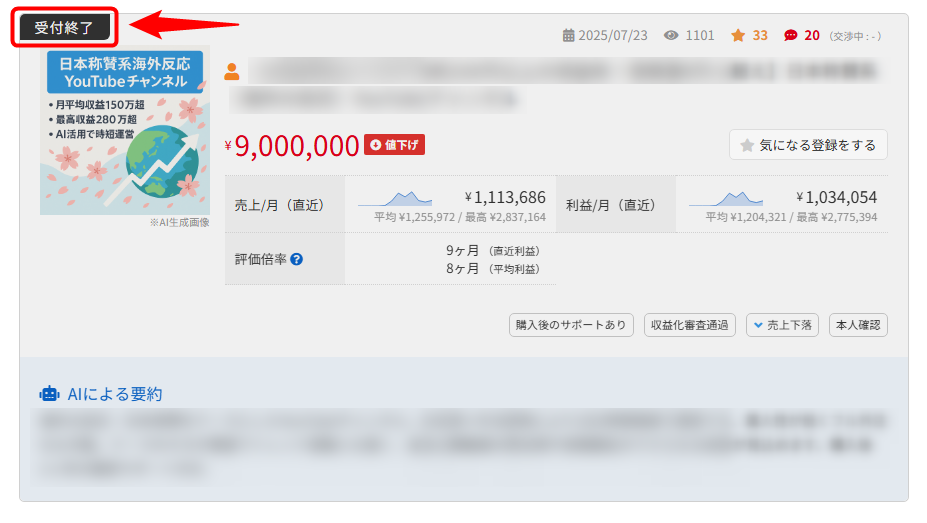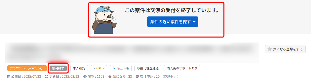 案件情報一覧や案件情報詳細ページにて「受付終了」のラベルがついている場合は、売主が交渉申込みを受け付けていない状態です。