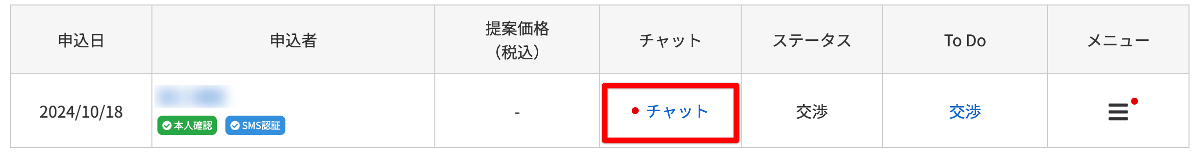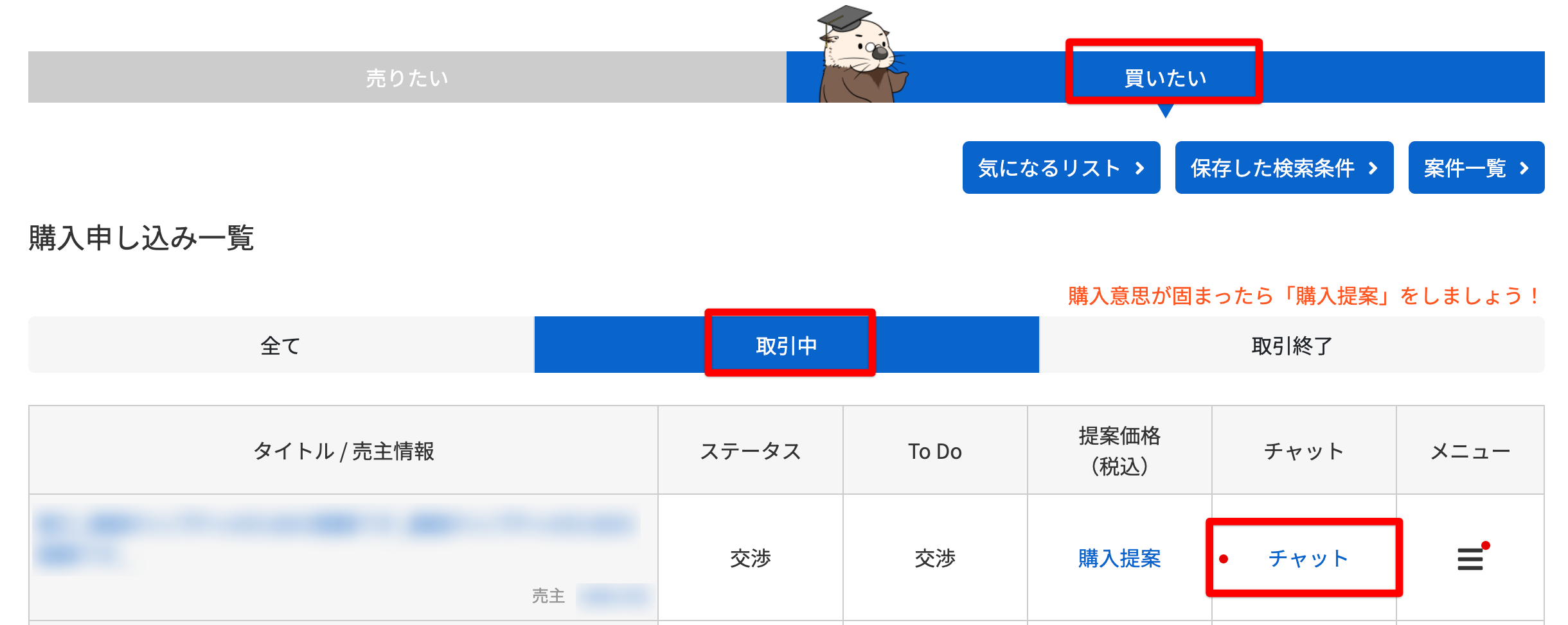 マイページの購入申し込み一覧より、対象案件の「チャット」をクリックします。