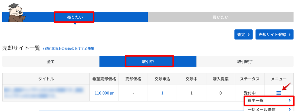マイページの売却サイト一覧より、対象案件のメニューをクリック>買主一覧を開きます。