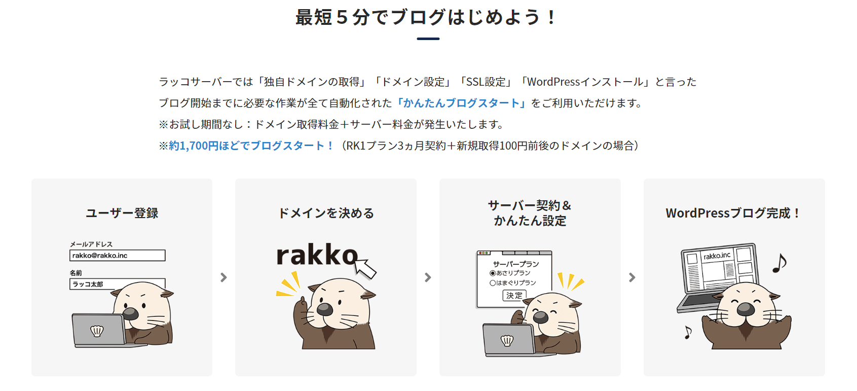 かんたんブログスタートならドメイン登録とサーバー契約~WordPressインストールにドメイン・SSL設定まで5分で手続き完了します。