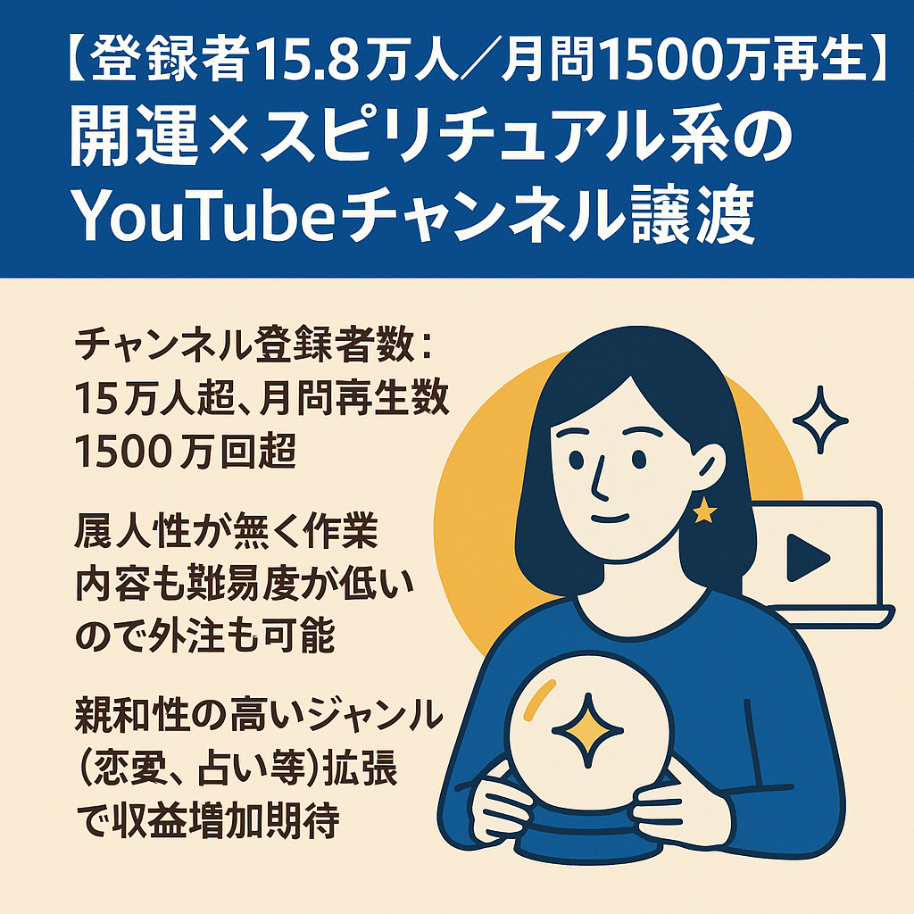 海外の反応ジャンルの属人性なしYouTubeチャンネル。収益化はすでに承認済みで、AIによる台本生成と外注スタッフの編集体制が確立されており、オーナー稼働は最小限。動画管理シートや手順書、AIプロンプトなど運営資産も一括譲渡されるため、買収後すぐに同水準の制作フローを再現でき、さらなる動画量産・収益拡大を狙える案件です。